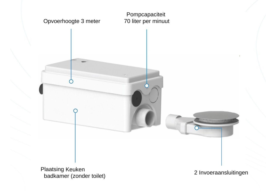 Dit is de oplossing om toch een douche te kunnen plaatsen waar geen afvoer beschikbaar is! De Douchebox D2 is een krachtige en compacte vuilwaterpomp, ideaal voor installatie naast of onder een douchebak, bijvoorbeeld in kelders of ruimtes zonder standaard afvoer. De pomp kan afvalwater tot 5 meter hoog wegpompen en heeft een maximaal debiet van 30 liter per minuut, geschikt voor huishoudelijk gebruik.