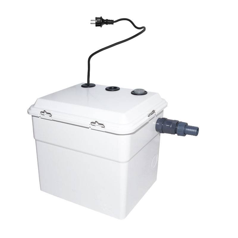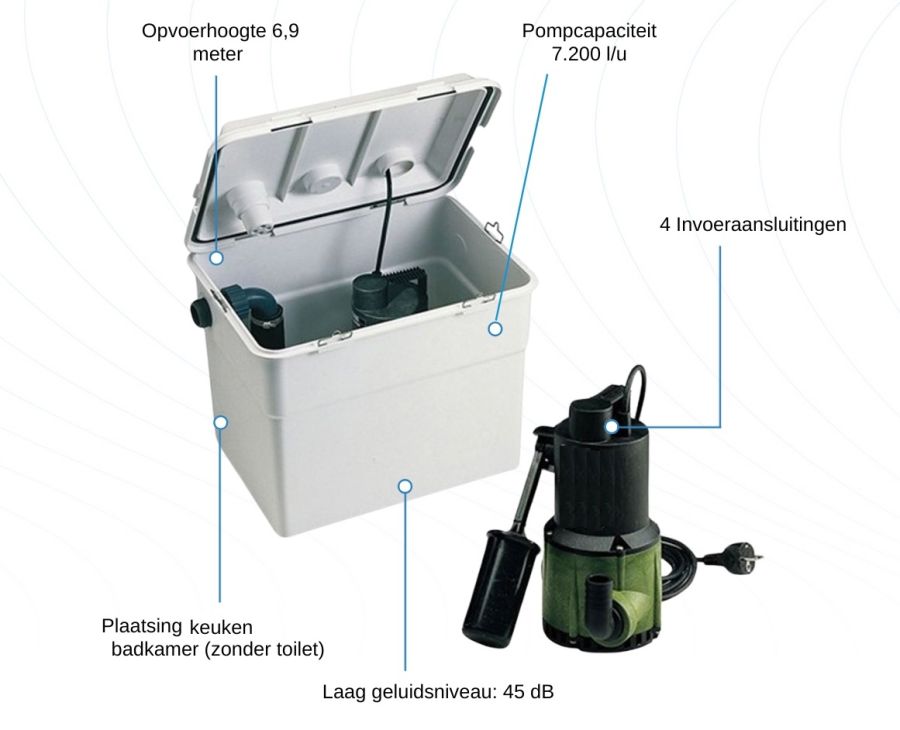Verzamelbox voor afvalwater afkomstig van douches, wastafels en huishoudelijke wasmachines. Collecteren en wegpompen van afwas- en schoonmaakwater. Geschikt voor afvalwater zonder vaste bestanddelen en/ of vezels, warm en koud water, geen fecaal water. Er mag in geen geval gebruik gemaakt worden van ontvlambare of explosieve stoffen. Het station bestaat uit een reservoir van technopolymeer en heeft een inhoud van 30 liter. In het station is een dompelpomp NV300 - SV met automatische vlotter gemonteerd. Het leidingwerk in het station is inbegrepen. Om terugstroming te vermijden is een terugslagklep gemonteerd in de perszijde van de pomp. Bij de afvoer van douchewater wordt een speciale douchevlotter gebruikt welke standaard wordt meegeleverd.
